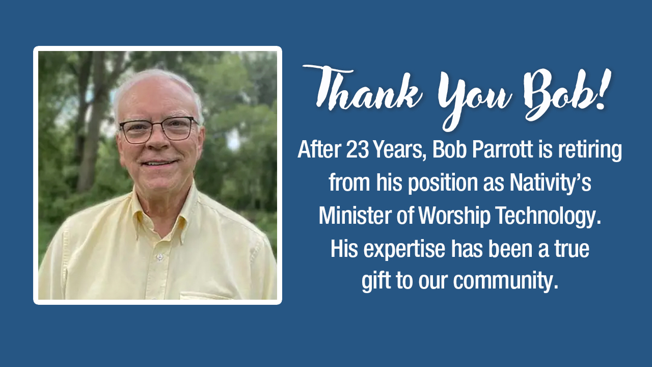 The weekend of December 6-7 we will honor Bob Parrott, Nativity’s outgoing Minister of Worship Technology, who retired from his position last month. A long-time member of Nativity with his late wife, Gerry, Bob has run Nativity’s worship technology for 23 years. He helped Nativity with two major worship technology upgrades in 2008 and 2015, the second of which was fortuitous because it helped Nativity manage offering online worship during the pandemic.