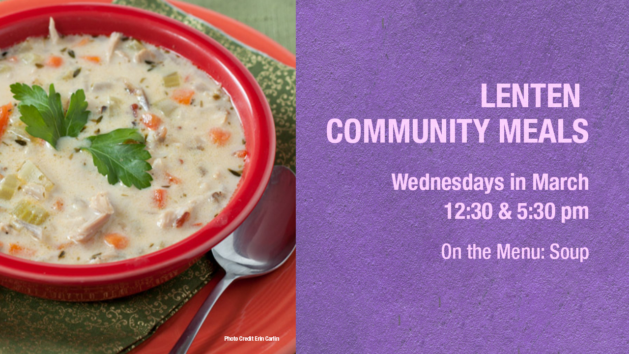 A lunch of soup, bread, fruit, dessert, and drink will be served in the Commons for $5.00 per meal. A dinner of soup, bread, salad, fruit, dessert, and drink will be served in the Fellowship Hall for $6.00/person or $20.00/family.